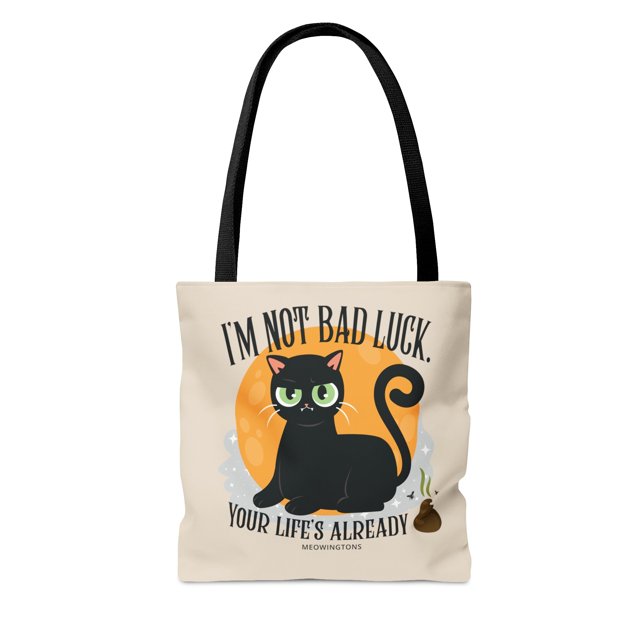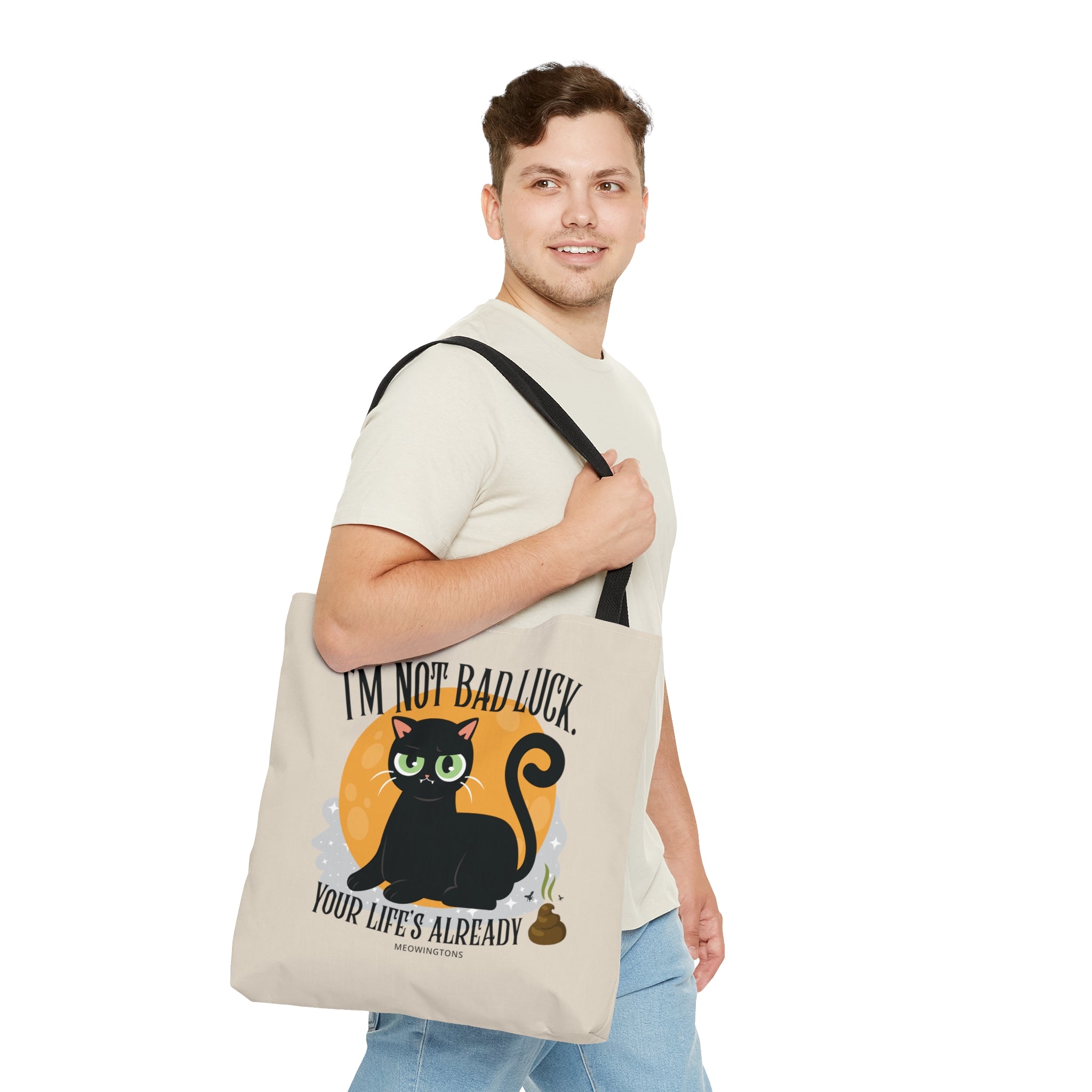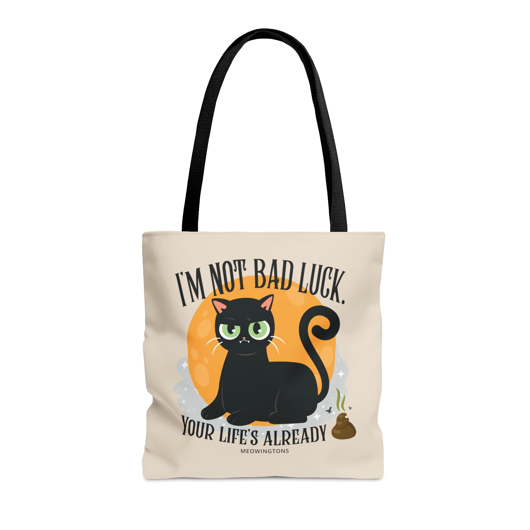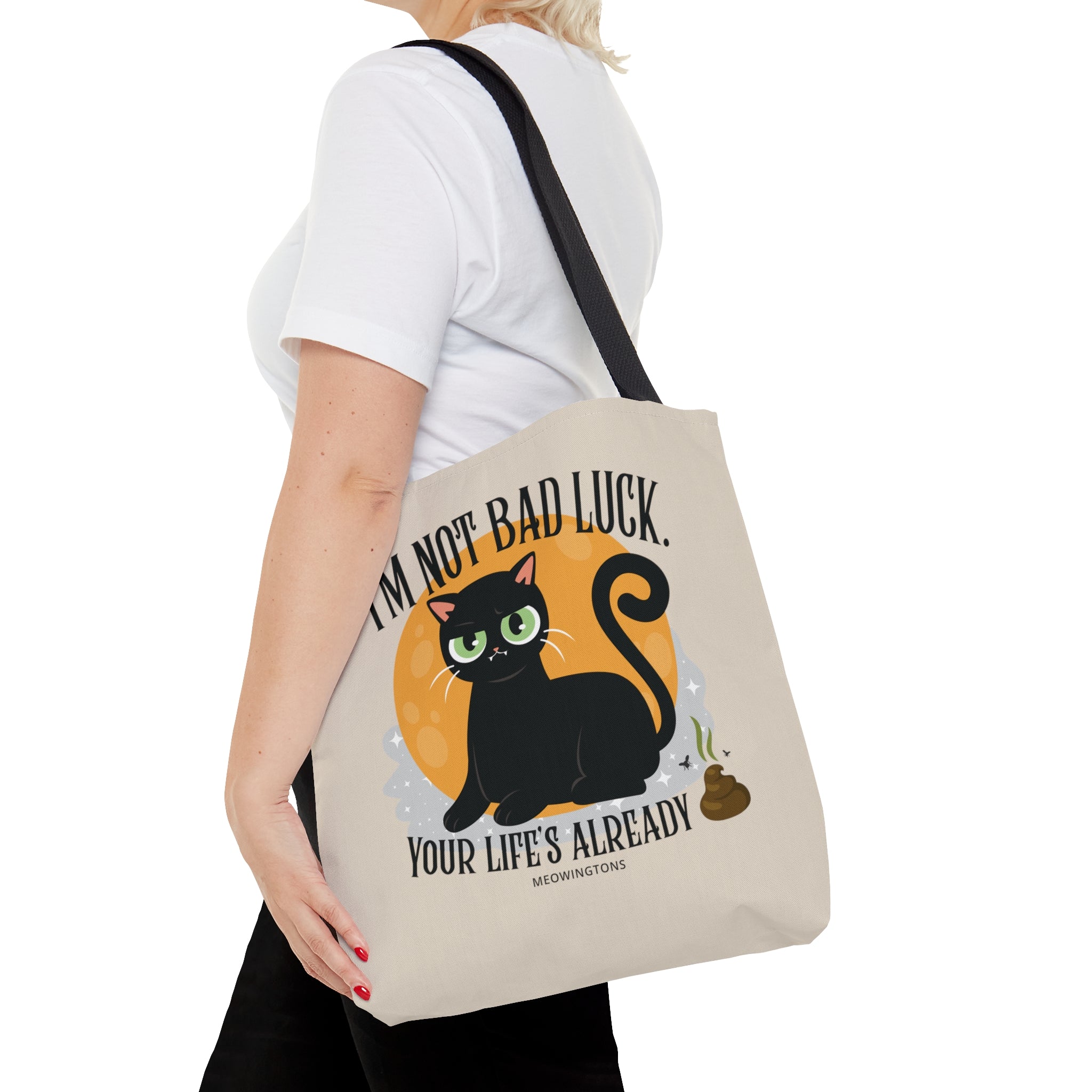 Introducing our Black Cats Aren’t Bad Luck Tote Bag – the purr-fect blend of sass and style for this Halloween season! Have you ever met a cat with more attitude than a black cat under a full moon? This cat tote bag features a cheeky black cat silhouetted against a glowing moon, and it's here to set the record straight: Black cats aren't bad luck, your life was already shitty. With a sense of humor as sharp as their claws, this cat knows how to keep it real during Halloween (or any time of year). With its wide bottom and boxed corners and added stability, this tote will totes tote your tote-ables, whether it’s groceries, knitting supplies, or your ever-growing crystal collection on their way to charge under the full moon.