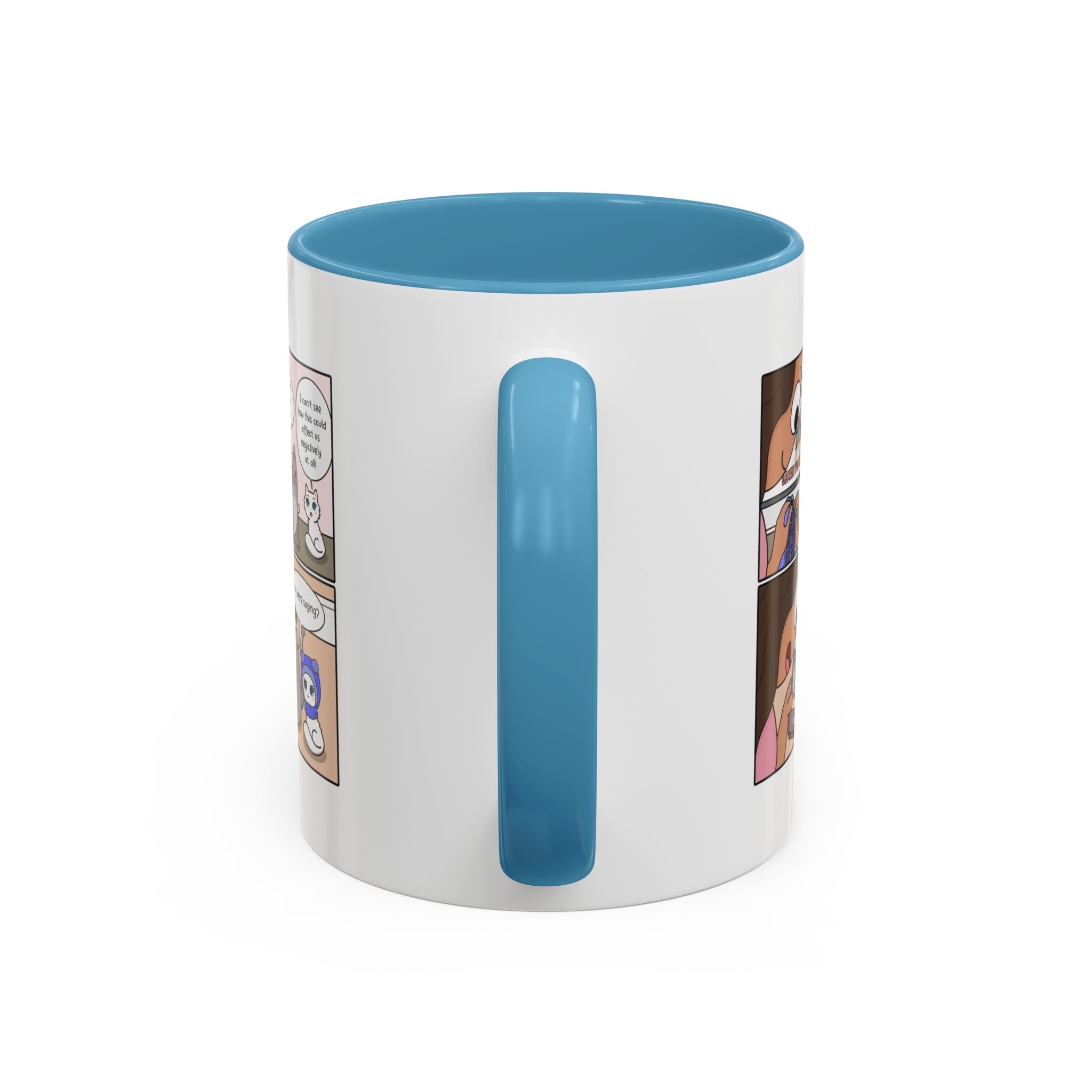 The Cat Crochet Comic Coffee Mug is available in the following options: 11oz / Pink, 11oz / Light Blue. Check the product page for current stock availability.