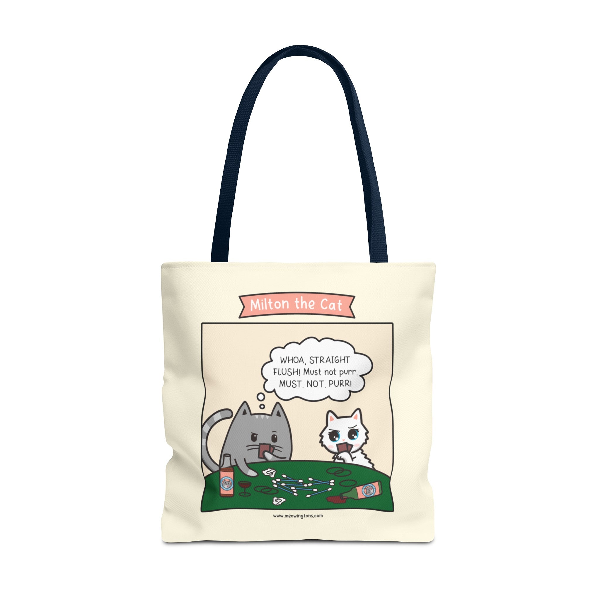 Introducing the Cat Poker Comic Tote Bag – a charming addition to our Milton the Cat Comic Collection, featuring everyone's favorite sassy tabby and his adorable sidekick, Millie. These two mischievous felines steal the show in our webcomic, Milton the Cat.