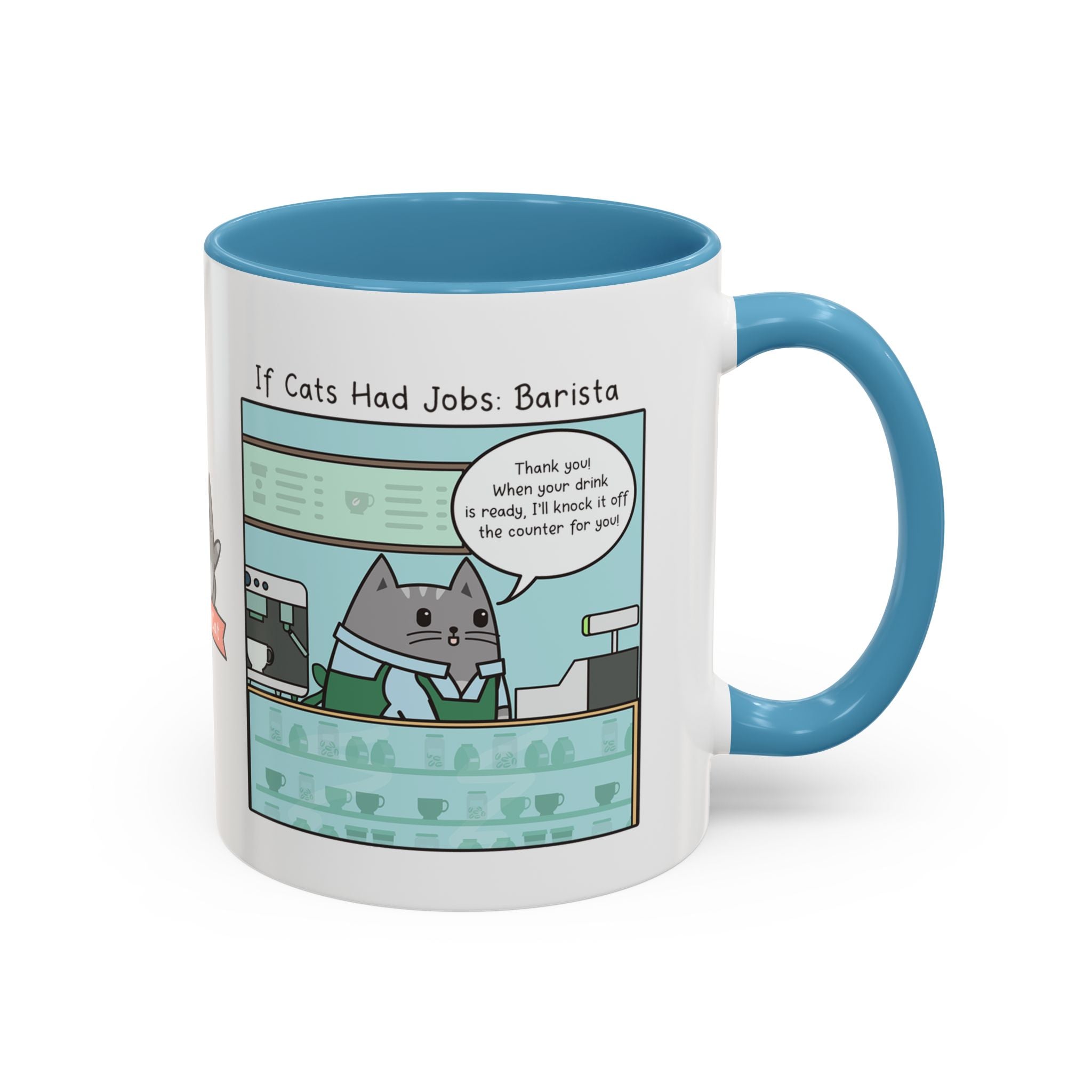 But the real star of this mug is the captivating comic strip starring Milton, the beloved character from the Milton the Cat webcomic. Join this tubby tabby as he takes on the role of a purr-fect barista, brewing up a bit of laughter...if your order ever makes it to you...and we hope you don't mind a bit of cat hair in your coffee.