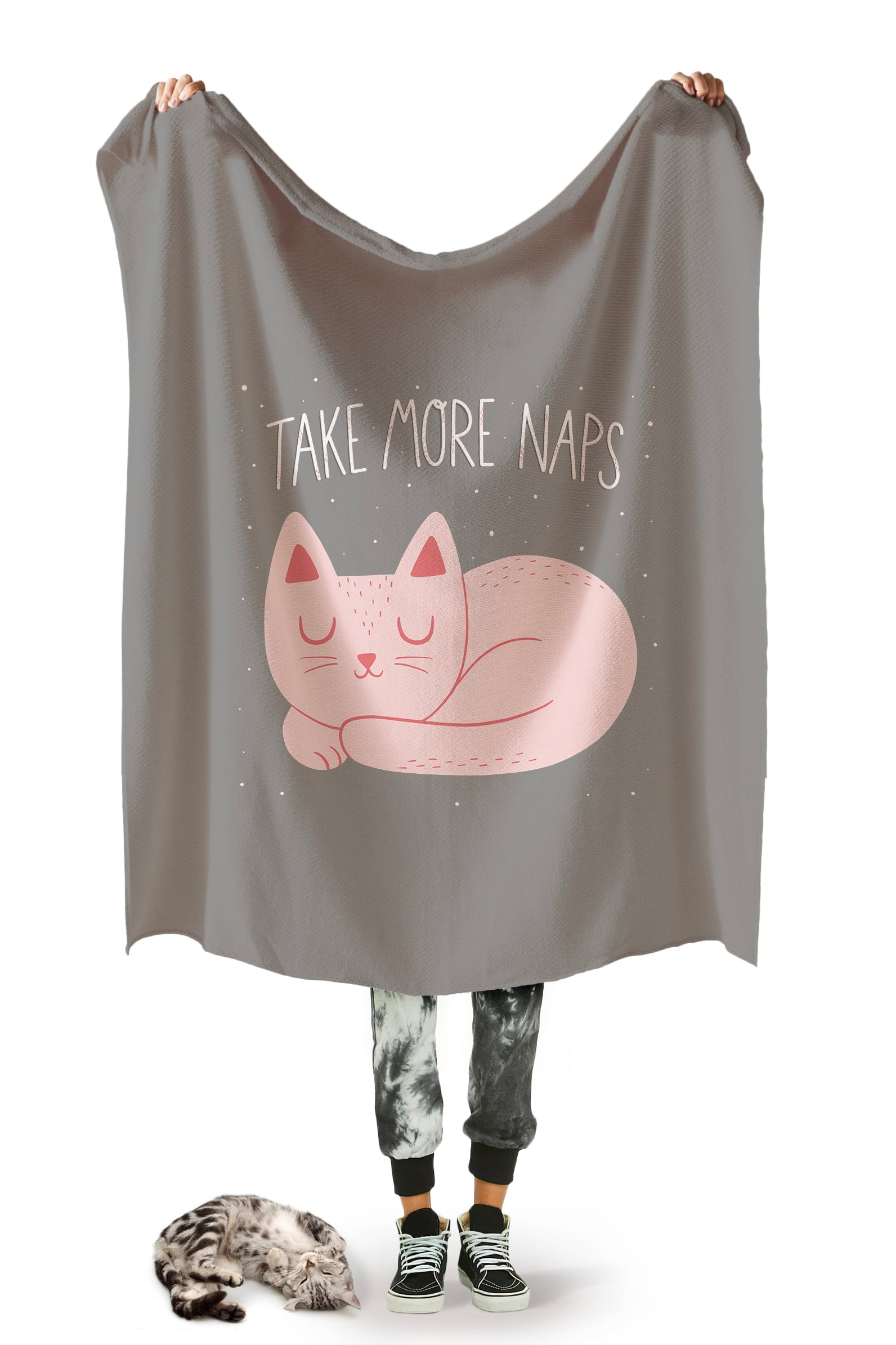 Ready for the ultimate nap experience? Look no further than the Take More Naps Sherpa Blanket! This cat print throw blanket features a pastel pink kitty curled up for a catnap and a whimsical text that reads, “Take More Naps.” Because here at Meowingtons, we know we have a lot to learn from our feline counterparts; including the need for more naps! The front of each blanket is made from 100% Polyester, and the reverse is lined with soft-to-the-touch, vegan Sherpa fleece for extra cozy comfort.