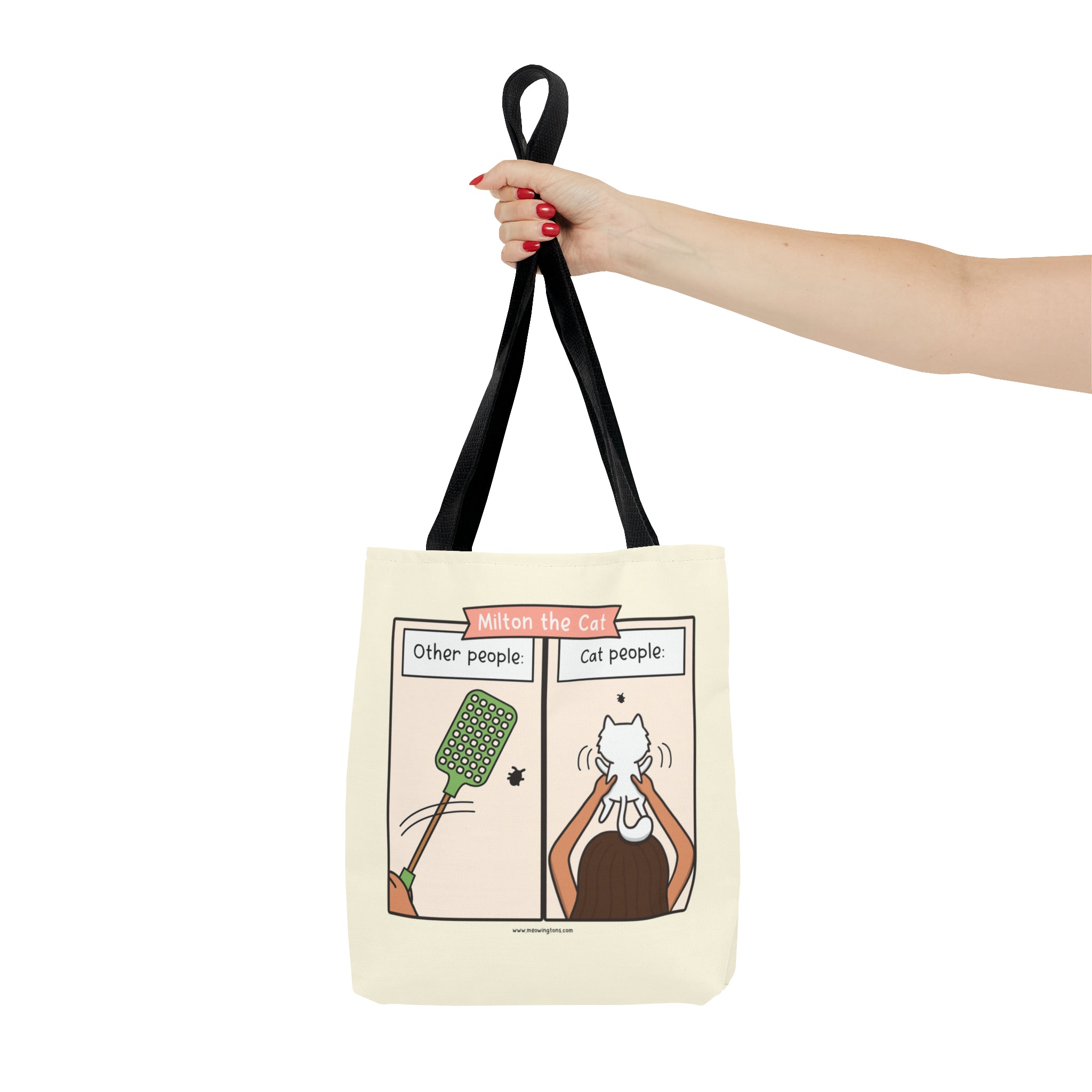 Introducing the Other People vs Cat People Comic Tote Bag – part of our Milton the Cat Comic Collection, featuring your favorite sassy tabby and his cute ball fluff of a sidekick, Millie. These two felonious felines are the star of our webcomic, Milton the Cat. This cat tote bag features Millie flexing her skills as an expert exPURRminator when joining up with her Human (aka The Can Opener).