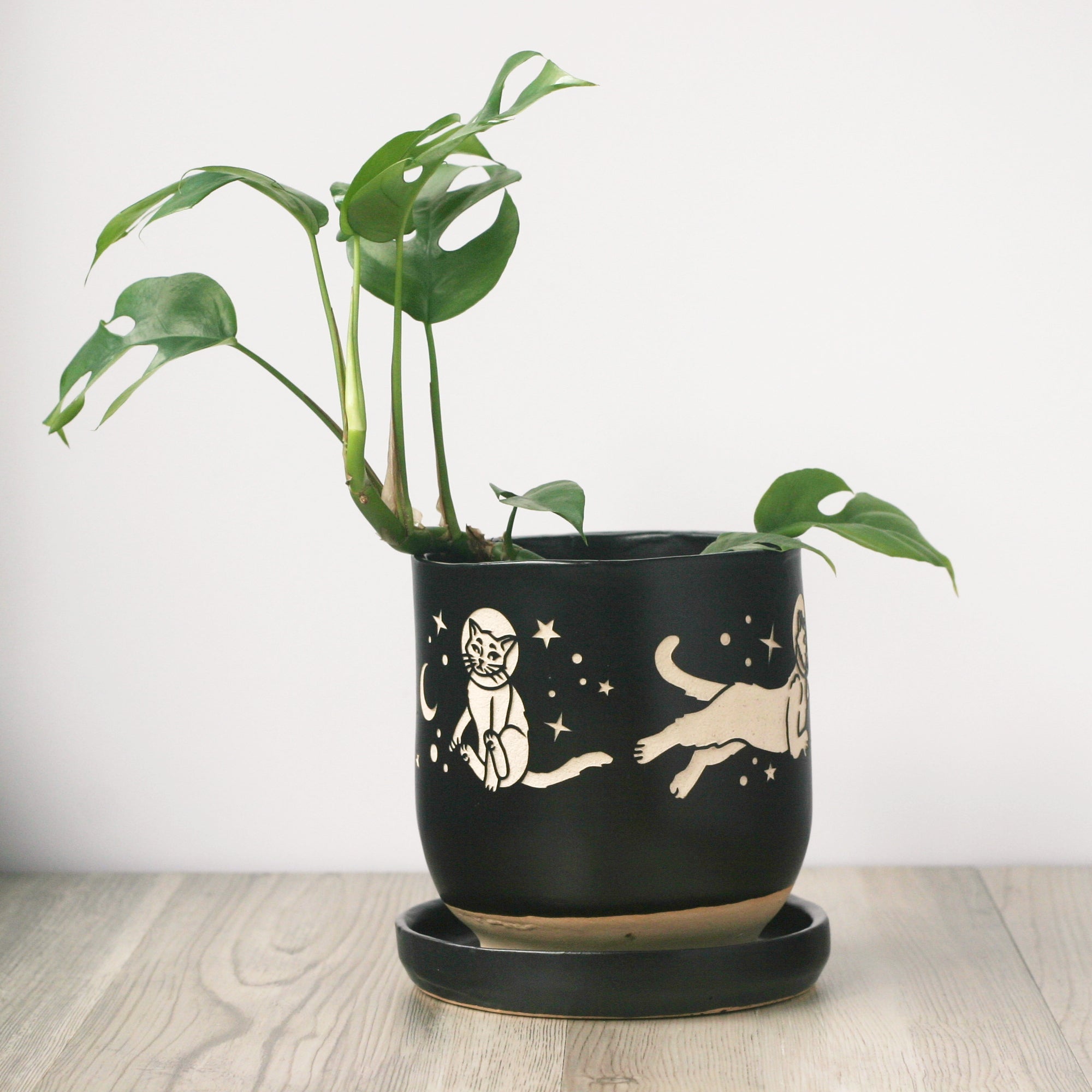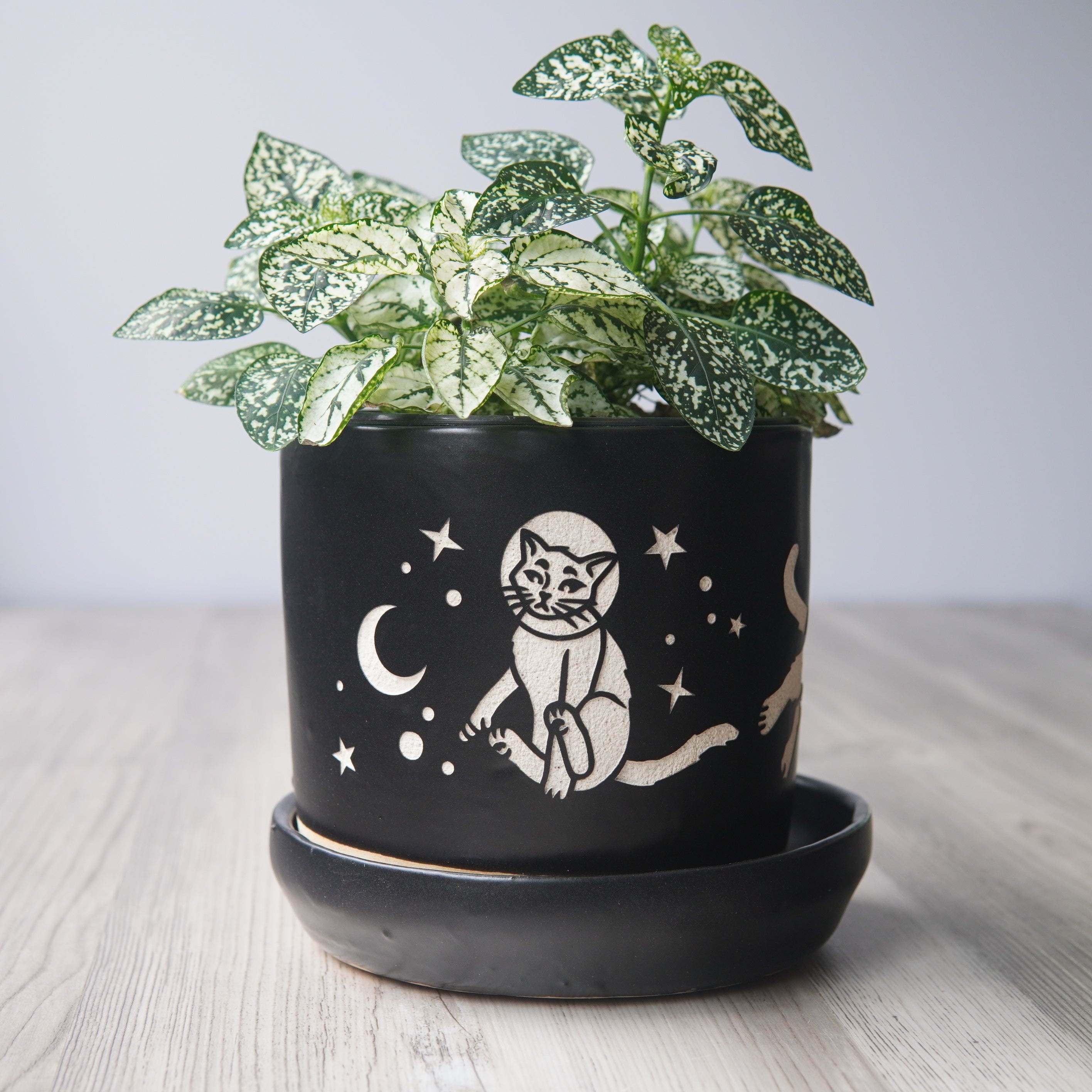 The Space Cats Farmhouse Planter with Saucer is available in the following options: 5" Pot / Black, 5" Pot / Cobalt Blue, 5" Pot / Gray, 4" Pot / Black, 4" Pot / Cobalt Blue, 4" Pot / Gray. Check the product page for current stock availability.
